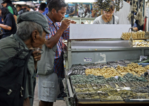 Wystarczy wejść i rozejrzeć się na boki, żeby zobaczyć ogromną ilość stoisk z jeszcze większą ilością figurek, medalionów, płytek i tabliczek. A pomiędzy nimi znawcy ze szkiełkami powiększającymi w oczach przyglądają się kolejnym egzemplarzom i wybierają te szczególne. Według jakich kryteriów to tylko oni sami wiedzą. Ceny niektórych z talizmanów osiągają wręcz astronomiczne poziomy. Ale wystarczy wyjść z głównej części targu, żeby na jednym ze stoisk w bocznej uliczce kupić garść amuletów za 30 bahtów. Tak na szczęście.